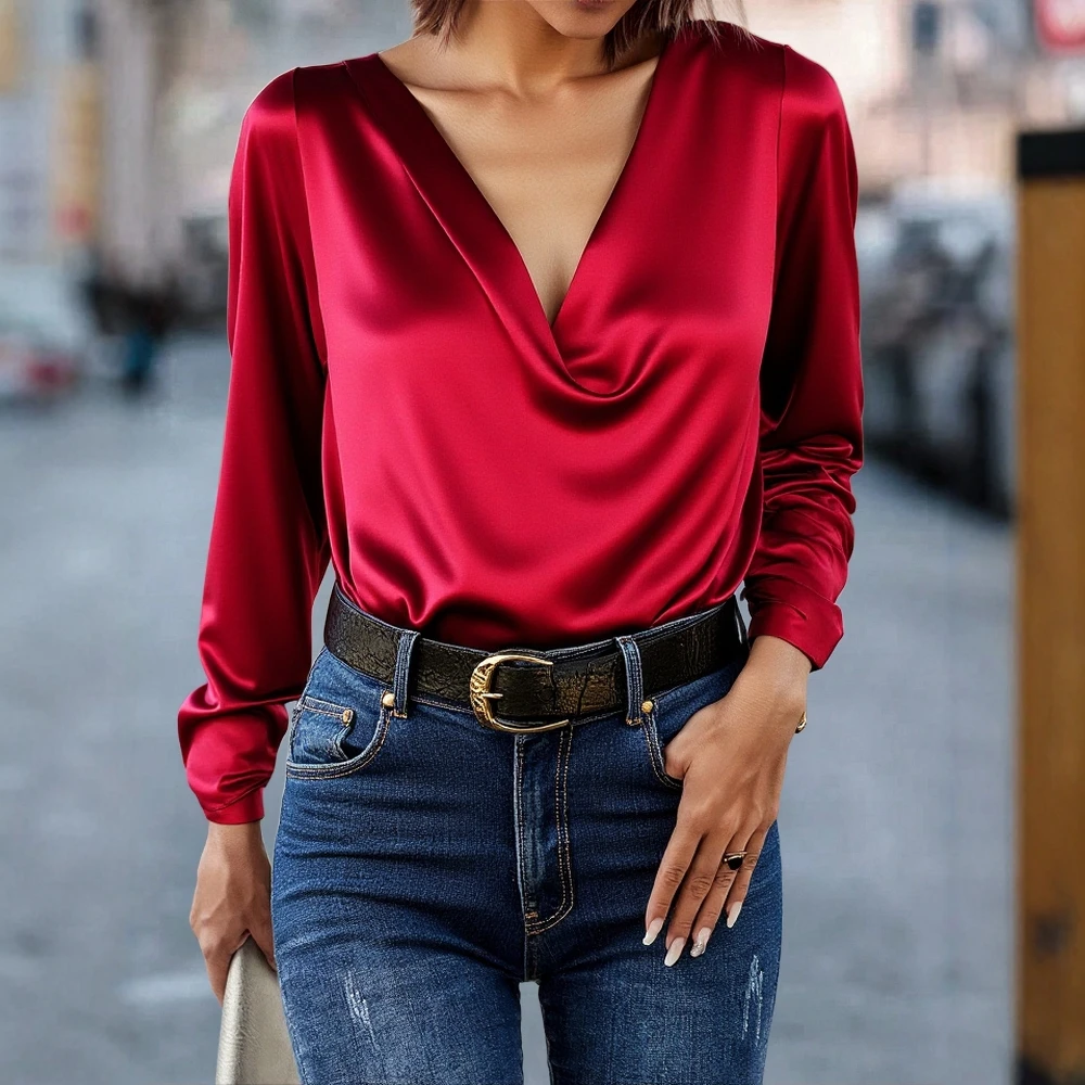 Women's Blouses 2025 Autumn Office Elegant Solid Color Long Sleeve Cowl Neck Fitting Slim Business Blouse